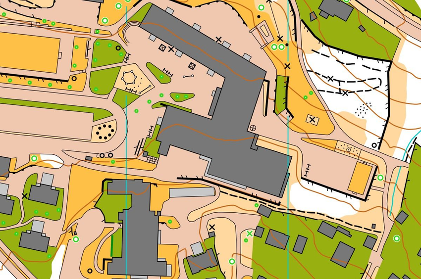 Her er et skoleområde med bygninger, lekeplasser, noen trær og gressplener. Dra i «slideren» for å sammenlikne flyfotoet med et orienteringskart over det samme området.