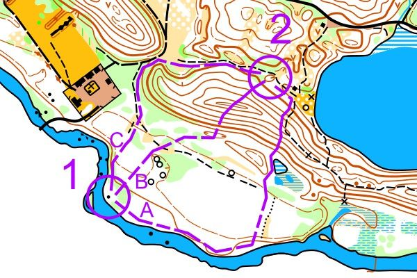 Dette kartet viser tre veivalg fra post 1 til post 2: